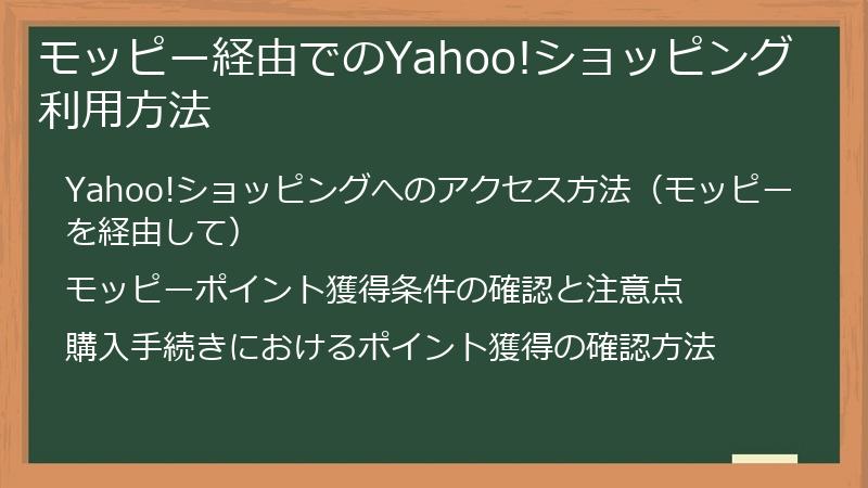 この項目では、モッピーを経由してYahoo!ショッピングを利用する具体的な手順をステップごとに解説します。