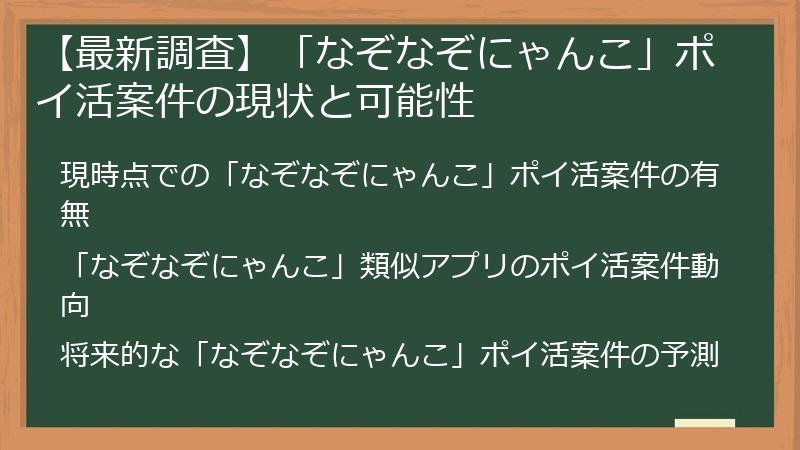 現時点での「なぞなぞにゃんこ」のポイ活案件の有無について、最新の調査結果と、もし案件が登場した場合の可能性を詳細に解説します。